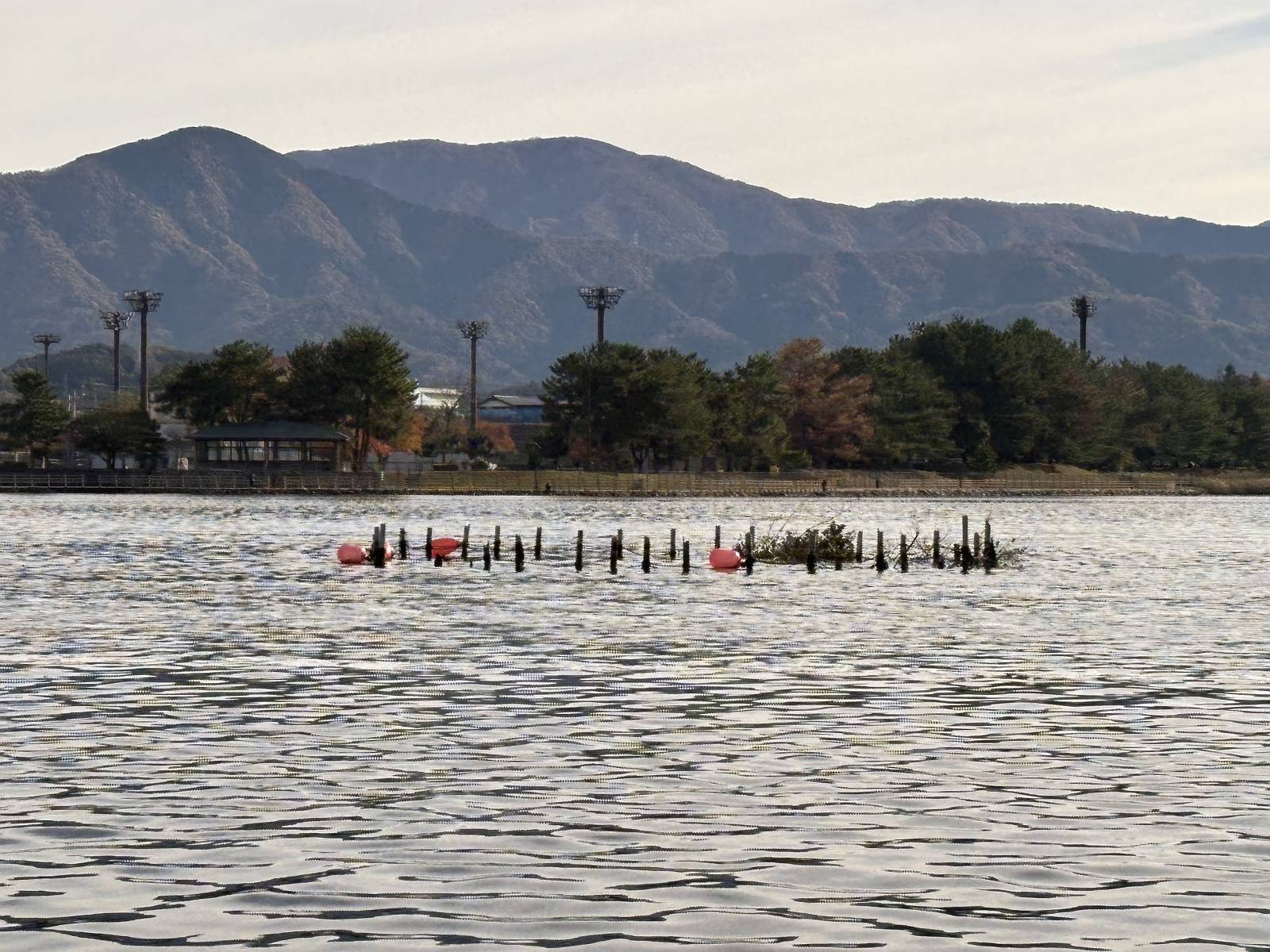 2025年の掘削にまつわるエピソード。掘削やぐらも大きくなり、パイプの設置方法も工夫して作業もさらに効率化。水月湖の年縞自体が地元に浸透してきて、掘削を始める前に式を開いたり、掘削中は遊覧船がやぐらの周りを巡っていったり(この日の午前中に遊覧船で聞いた話だ)。