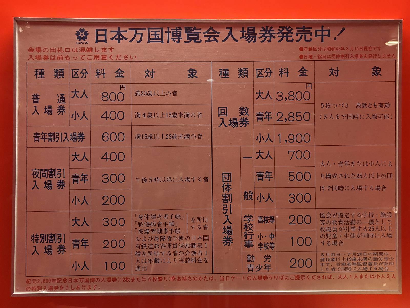 ところで入場料っていくらなんでしたっけ。なになに「年齢区分は昭和45年3月15日現在」って生まれてないですけど。それにしても普通入場券大人800円って安かったんだなあ。2025年万博なんて大人7,500円だぞ。