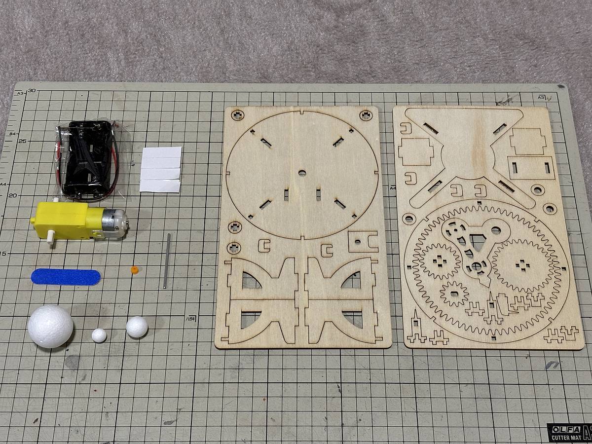 値段の割にはよく出来ていて、組めばそれらしい雰囲気になります。太陽と地球と月はあとで色を塗った方が実感的でしょう。発泡スチロールの球なので、ポスカ辺りでじゅうぶん塗れます。