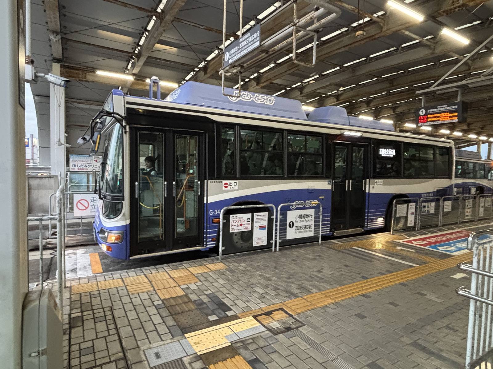 名古屋ガイドウェイバスの大曽根駅。鉄道扱いなのでバス停だけど「駅」なのですね。高架でバスの転回場まで作ってありますが、乗り場そのものは鉄道駅というよりバスターミナル。